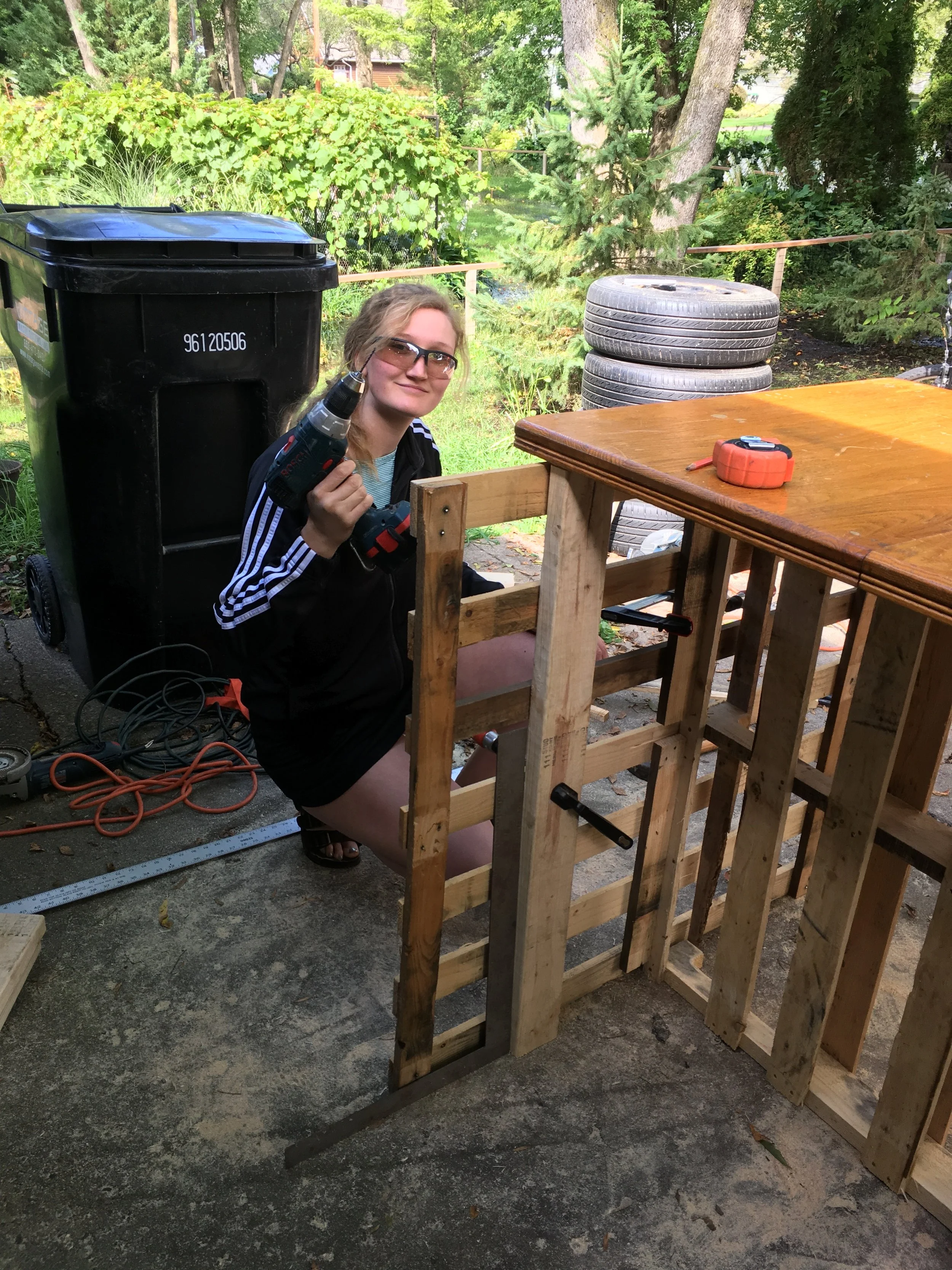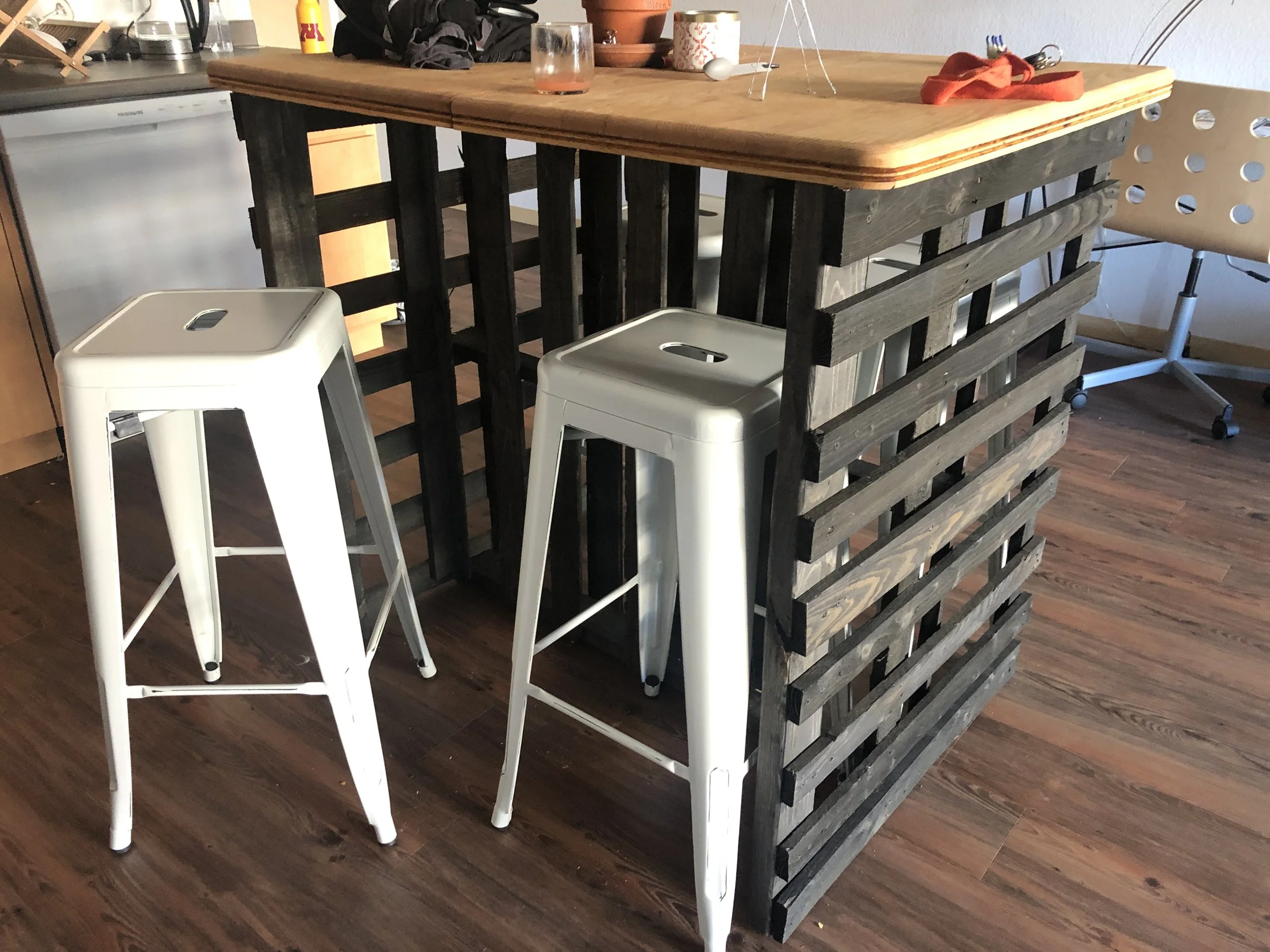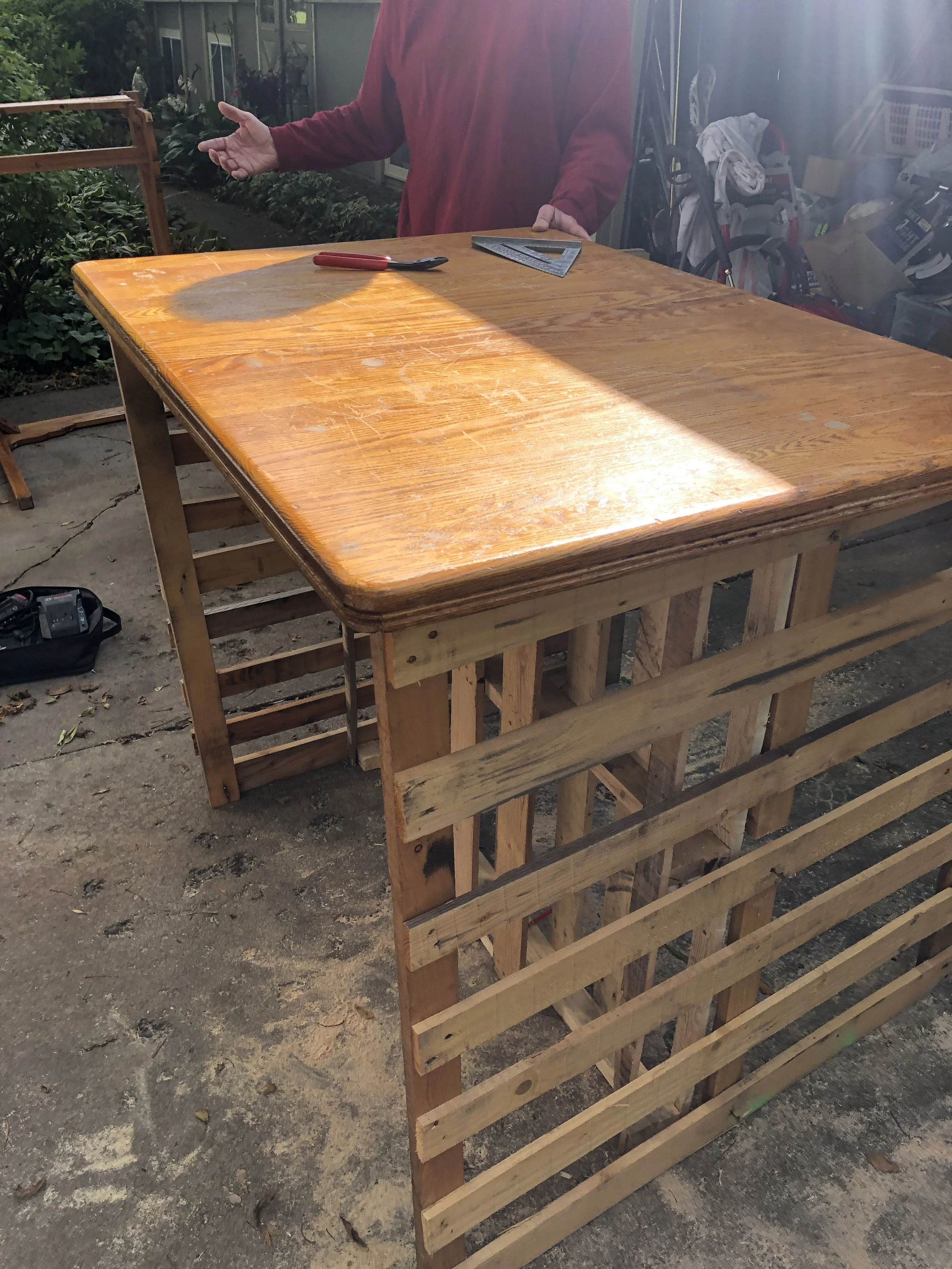 In 2019, I moved into my first unfurnished apartment. With limitations on how personalized one can make a rental unit, I looked for ways to make it my own. After finding an old beat-up tabletop without legs on the side of the road, I was determined to turn it into a functional kitchen island that highlighted its renovated origin!