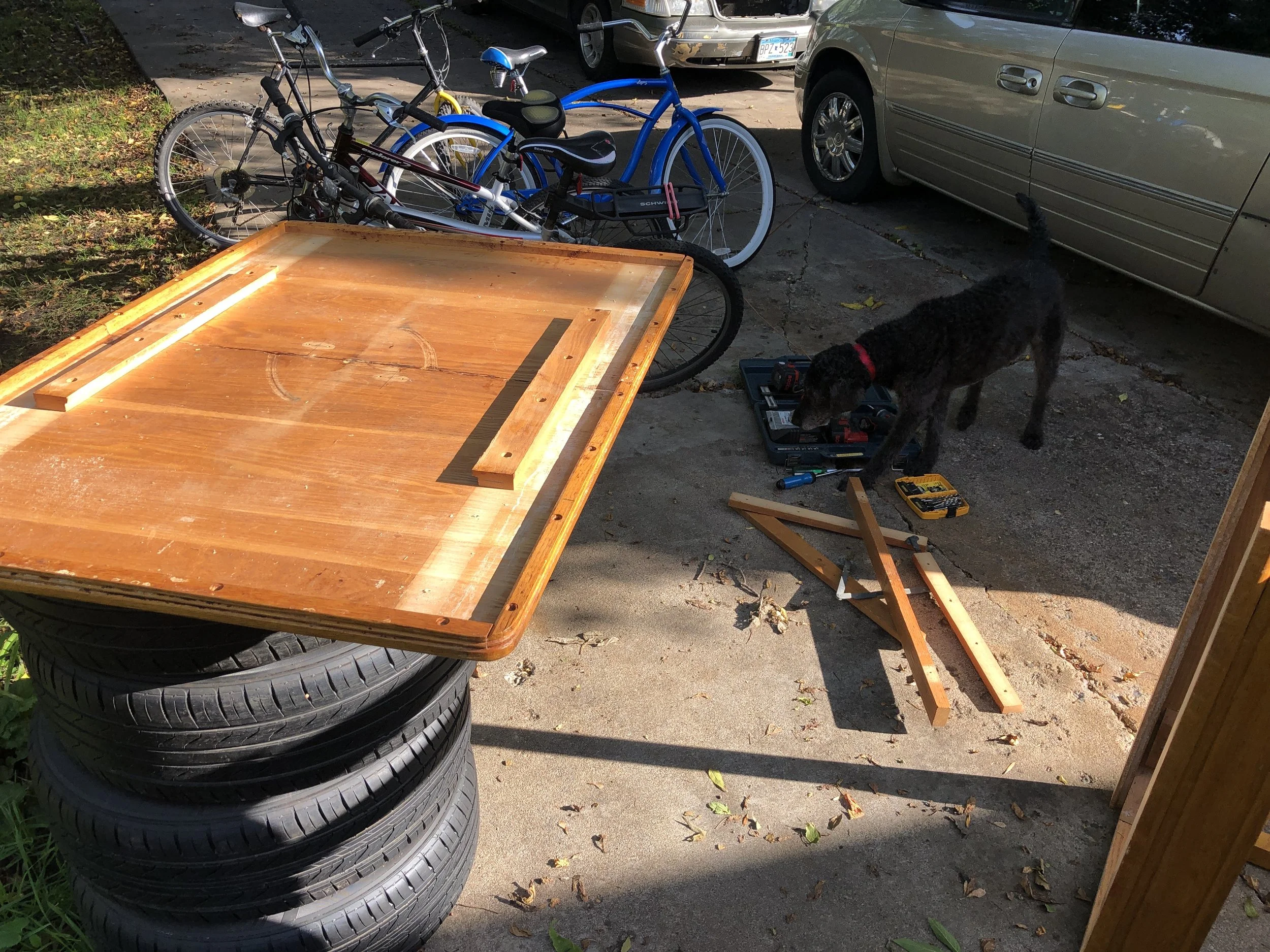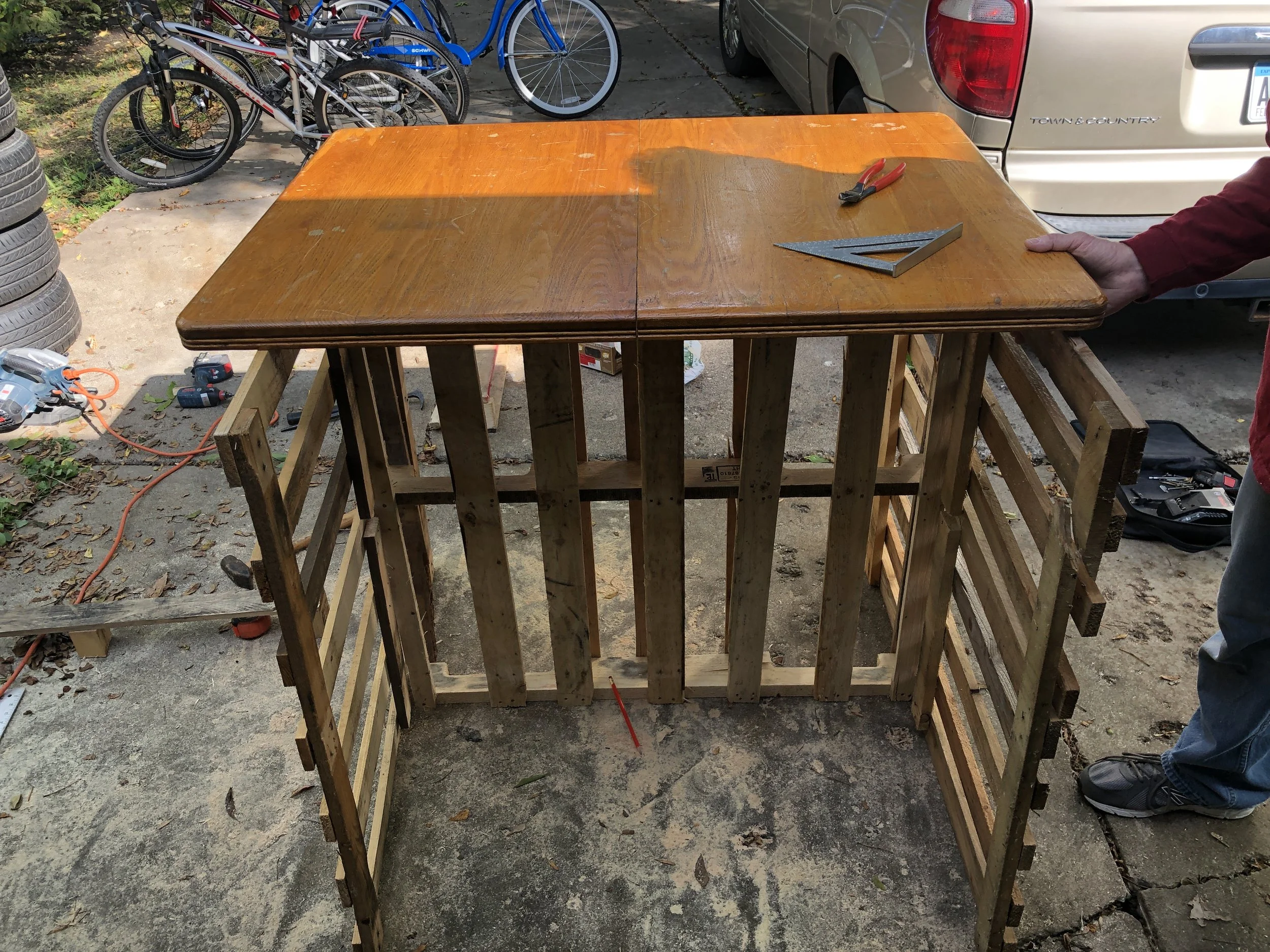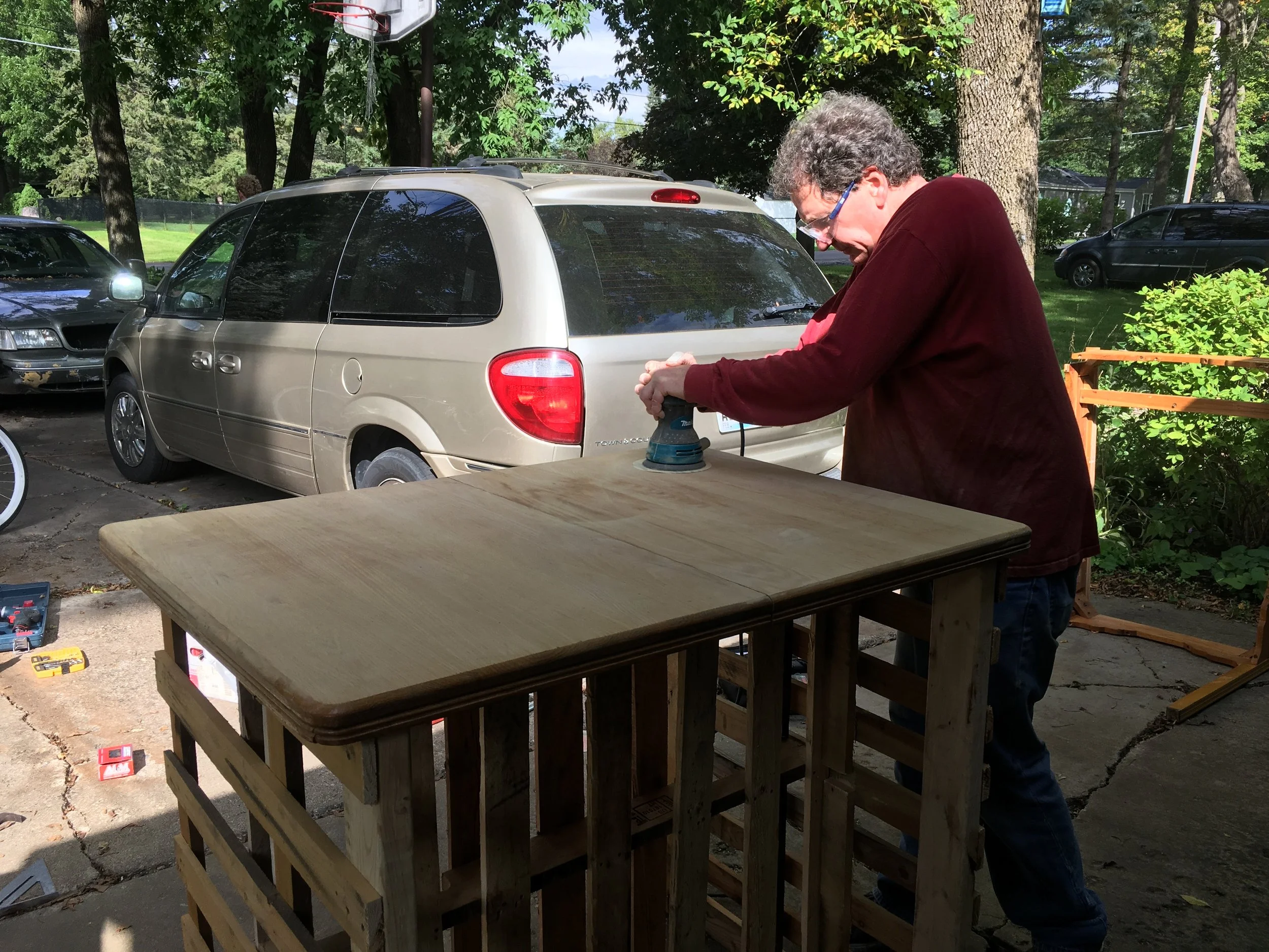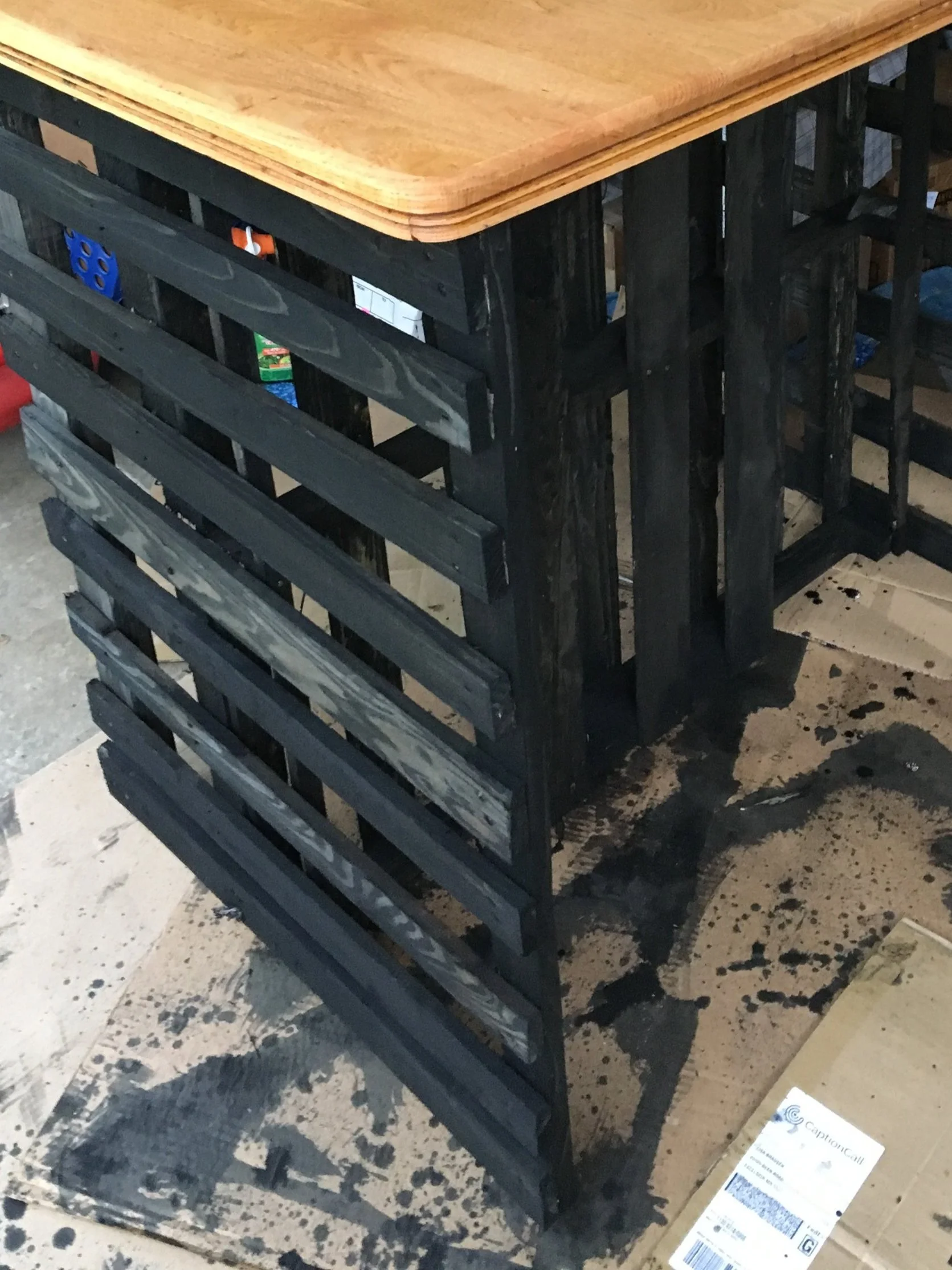 Through explorations of possible table legs to pair with the tabletop, I settled on utilizing beat-up wood pallets to up-cycle into the project. After construction, an application of oil-based black stain was added to the pallets to give them a more unified and clean appearance.